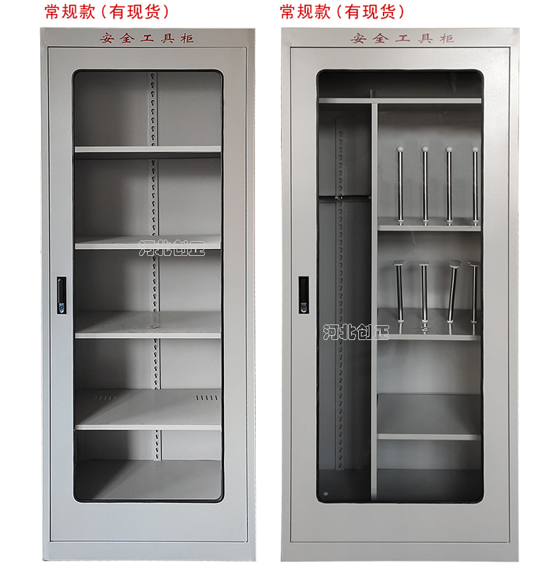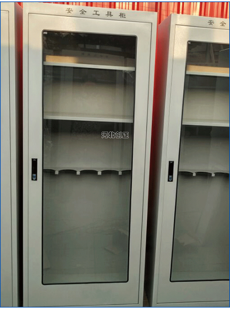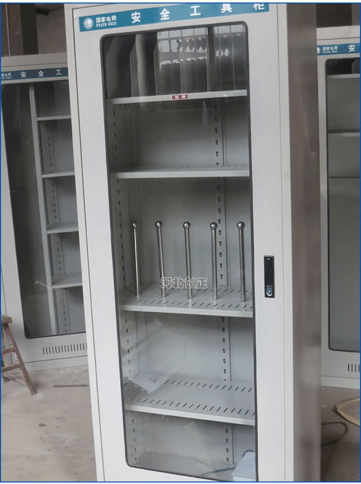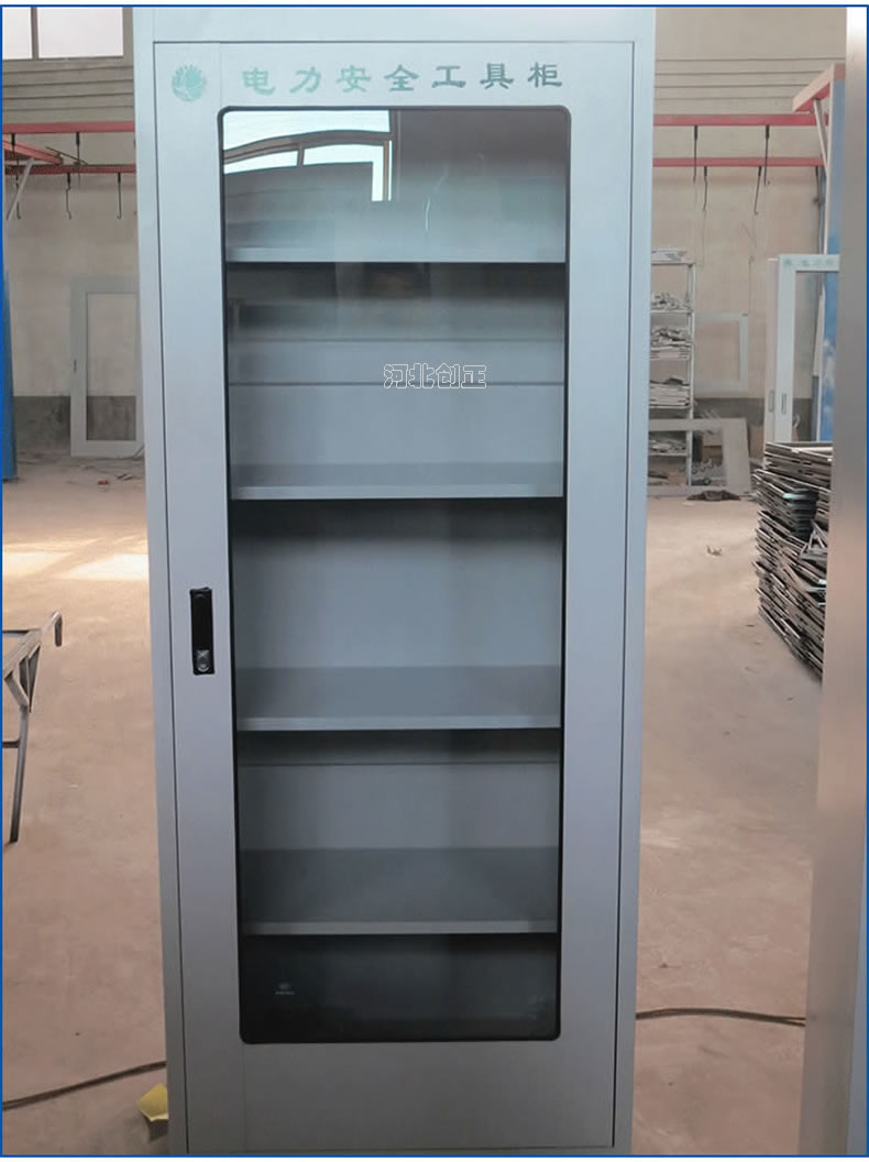 1、柜體是冷軋鋼板卷壓成型,厚度有1.0mm,1.2mm,1.5mm供選擇。柜體表面采用靜電防腐噴塑工藝,顏色為駝灰色,柜門裝有通體透明鋼化玻璃,透過玻璃可以看到分類有序的工器具。
